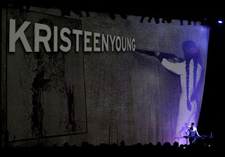 E eu ainda disse que a apresentação foi MARAVILHOSA? Sim, foi e muito mais! Então vamos pro lado bom da força: a noite começou com a cantora americana Kristeen Young subindo ao palco para cantar por meia hora. Sozinha, com um teclado e alguns samplers, diante de uma plateia impaciente, molhada e louca para ver seu ídolo. A música e a voz da garota lembram muuuuito a Bjork. Eu gostei, maridão entranhou no começo, mas depois curtiu também. Perto de nós havia um idiota gritando “fora” (duplamente idiota, pois o show constava da programação e o mala gritava em português), mas em geral o público respeitou a cantora. E tenho certeza de que muitos que reclamaram curtem a Bjork e achariam o máximo ela fazer a mesma coisa...